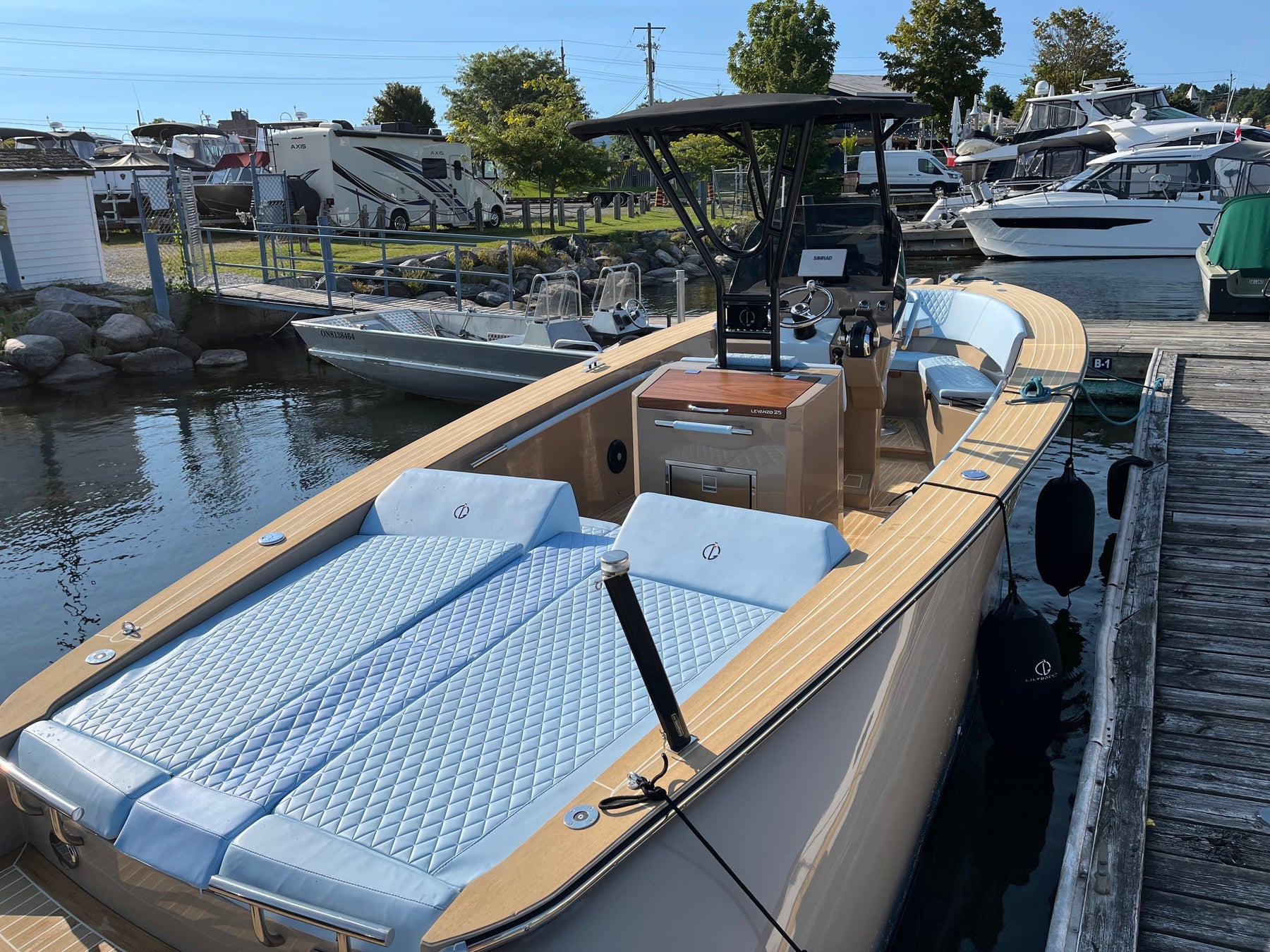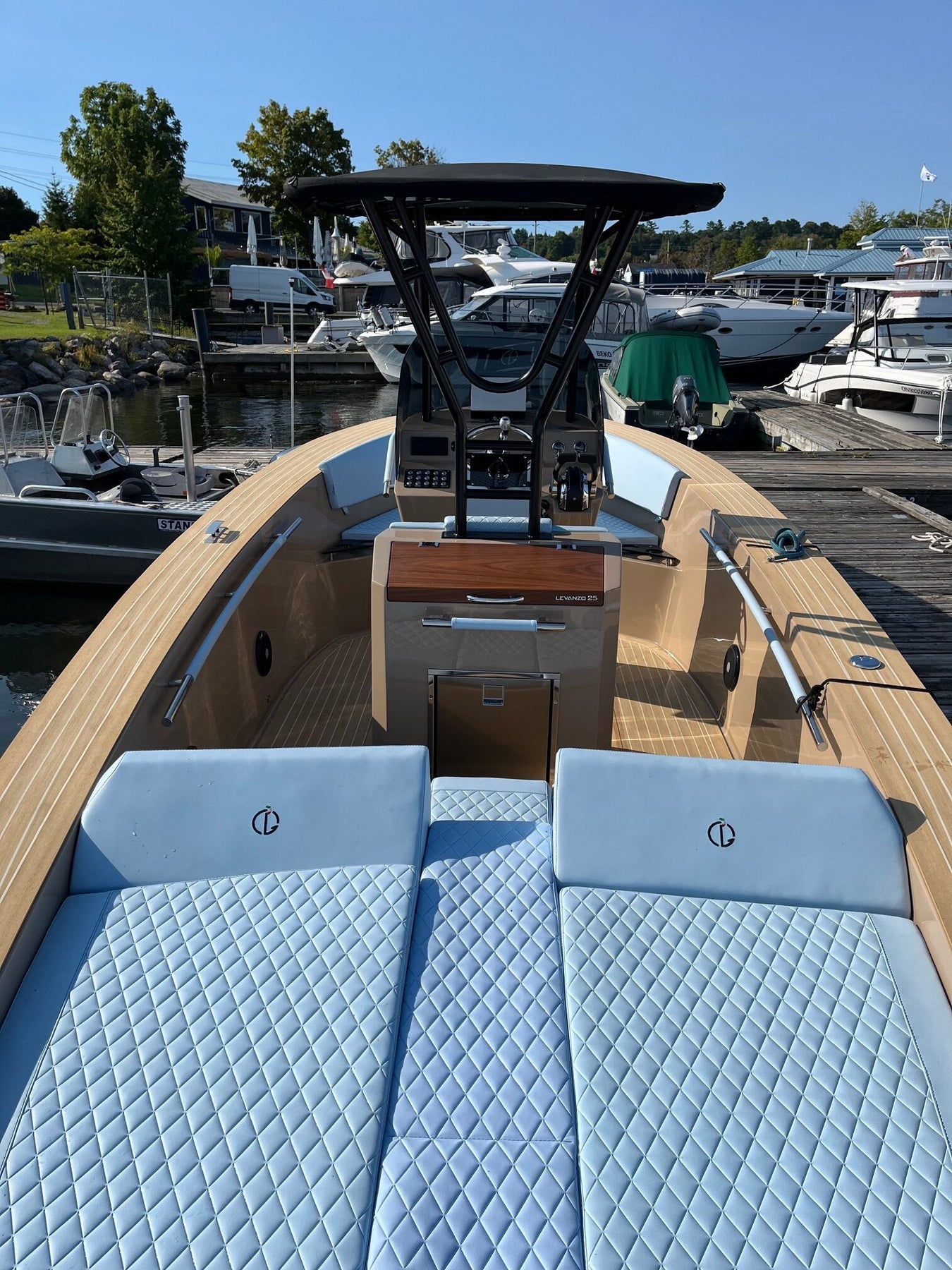 The Levanzo 25 hosts dual sunbathing areas: the fixed rear area is complemented by a central walkway that seamlessly connects the cockpit to the bathing platform. The forward area morphs into a dining zone with the addition of an adjustable column table. The slender central console, while accommodating all necessary instrumentation, maintains generous lateral transit surfaces, making the central part of the hull easily accessible and usable.