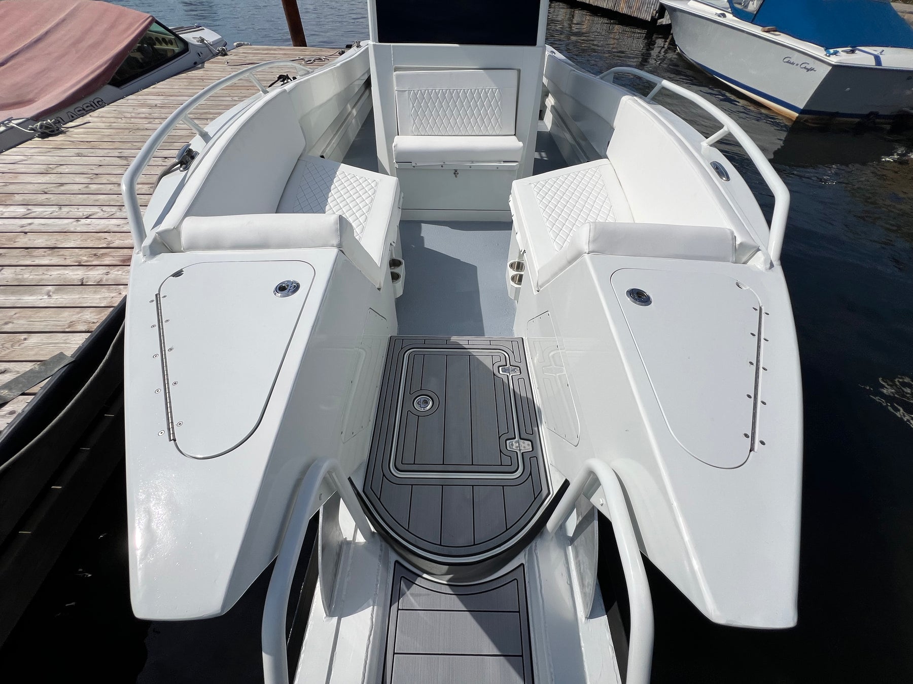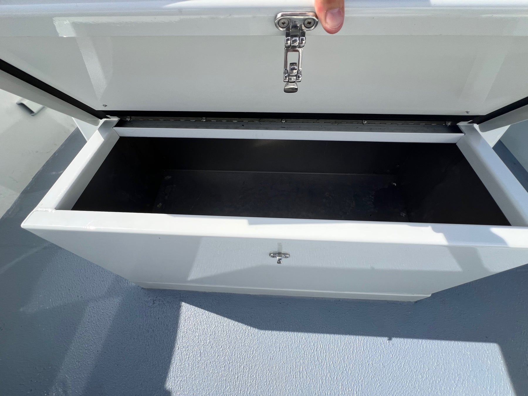 There is tons of storage on this boat & it looks amazing with its unique blue & white paint job.
