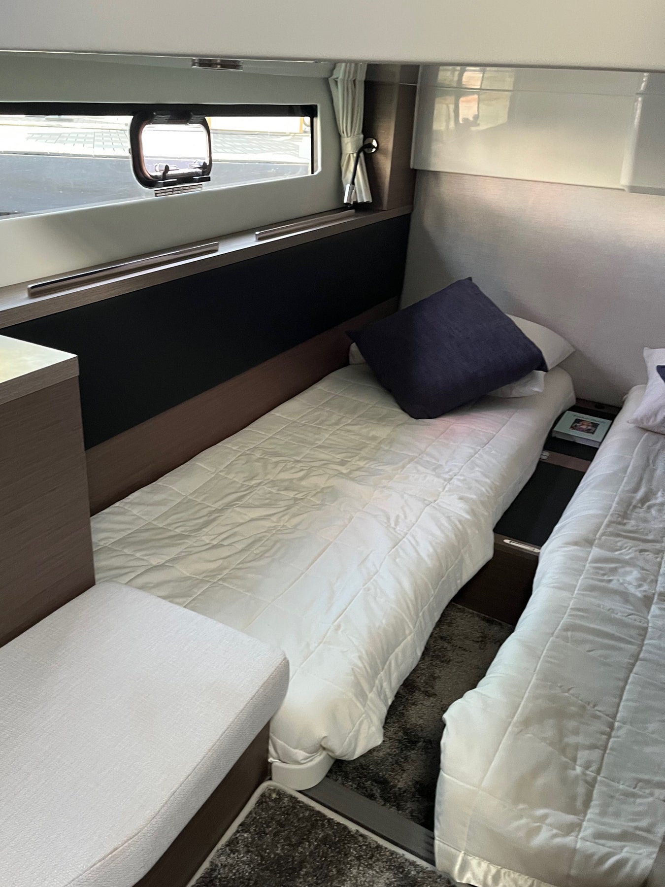 Created for family adventures, the NC 1295 Coupe delivers exceptional comfort for year-round cruising in any weather. The bright and airy salon is illuminated by natural light streaming through two opening glass hatches in the wheelhouse roof, enhancing ventilation. Featuring three cabins and two head compartments, this model boasts panoramic water views, large hull windows, a forward owner’s cabin with a separate shower, and guest cabins that can be configured with twin or large berths.